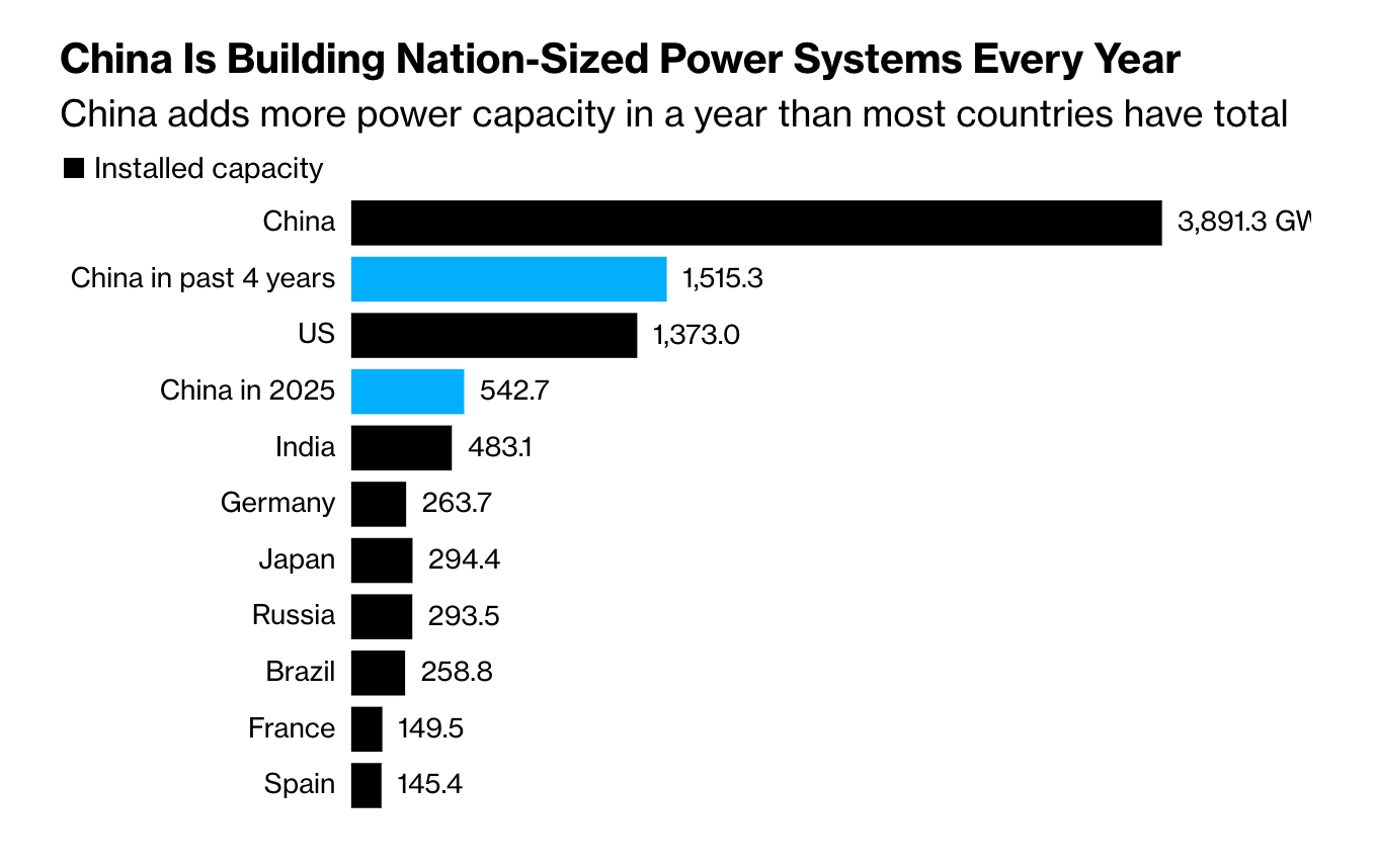 The first was this chart from Bloomberg which shows how China is undertaking an energy-building boom unlike anything the world has ever seen. It added 543 gigawatts of new capacity across all technologies last year, according to data from the National Energy Administration on Wednesday. That’s 12% more than all the power plants combined in India as of the end of 2024. The generation China has added since the end of 2021 is also larger than the entire US system.